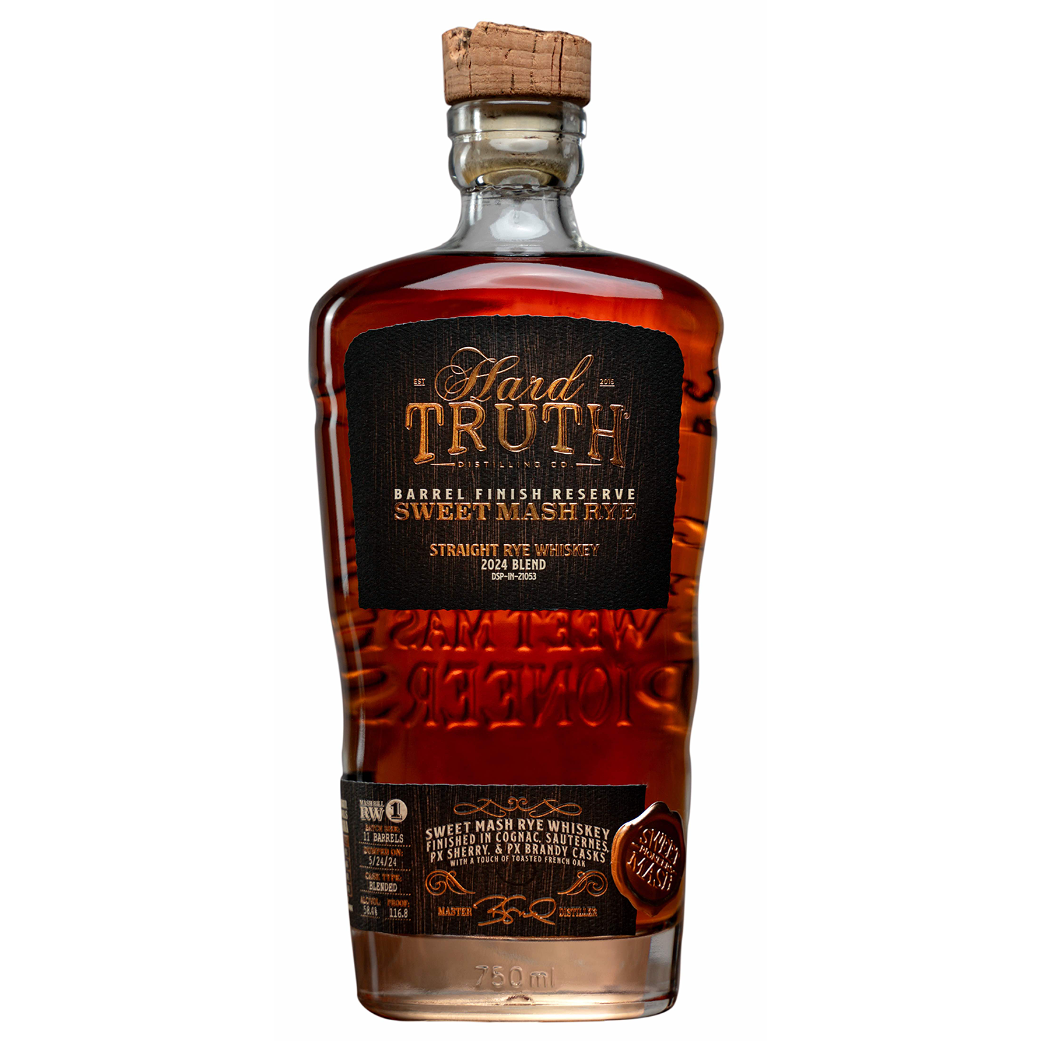 Hard Truth Barrel Finish Reserve Sweet Mash Rye 2024 Blend is a cask-strength expression from Hard Truth Distilling Co., an Indiana-based producer known for its sweet mash whiskeys and other craft spirits. Building on the success of its individual barrel-finished ryes from the previous year, which included finishes in Cognac, Pedro Ximénez Sherry, Pedro Ximénez Brandy, and Sauternes barrels, this blend combines those components at 31% Cognac, 26% Sauternes, 26% PX Sherry, and 17% PX Brandy, each finished for eight months before being rested on toasted Jupilles French oak. The result is a 3-year-old straight rye whiskey with a mash bill of 94% rye and 6% malted barley, bottled at 116.8 proof, and produced in a limited batch of 11 barrels with an MSRP of $89.99.